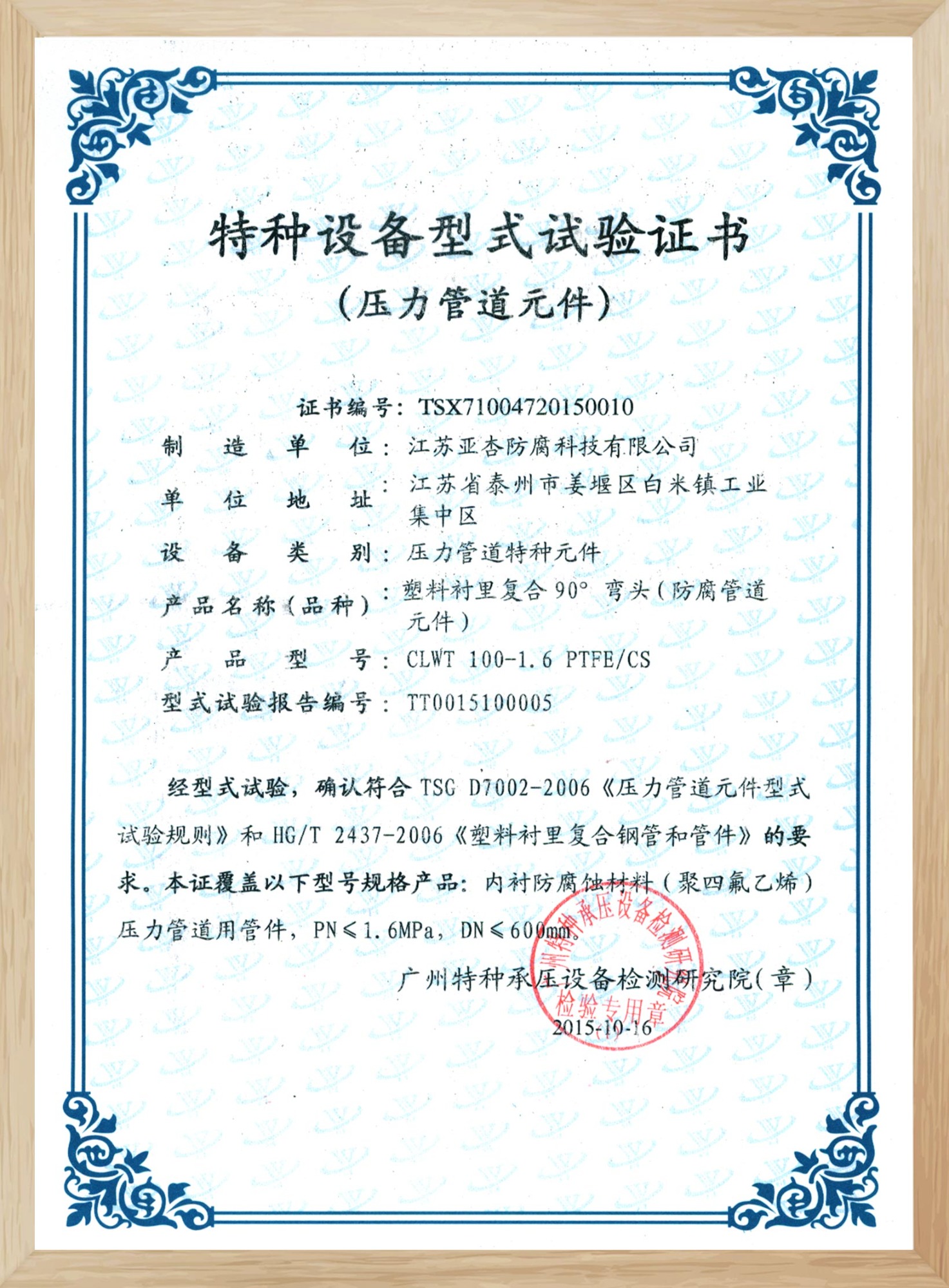 特種設備型式試驗證書